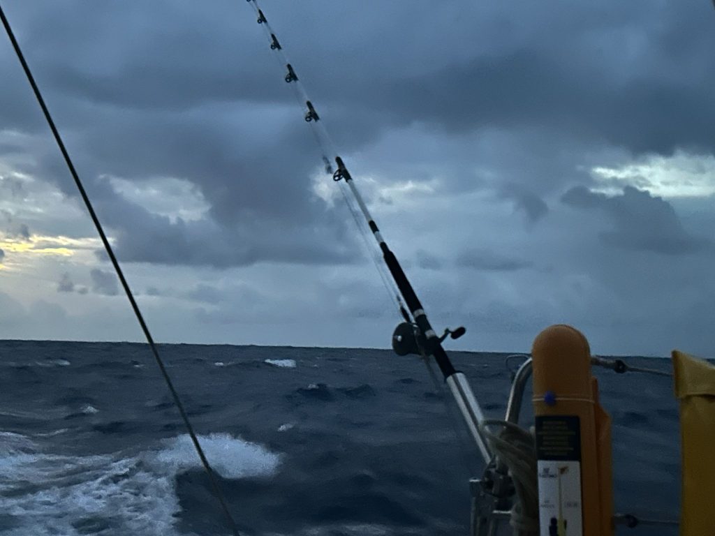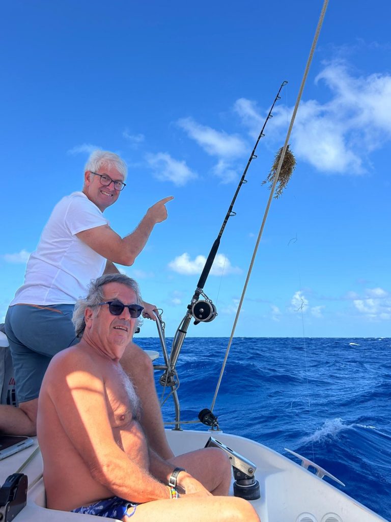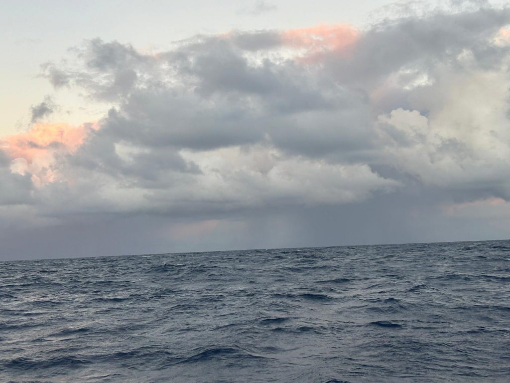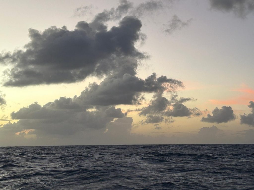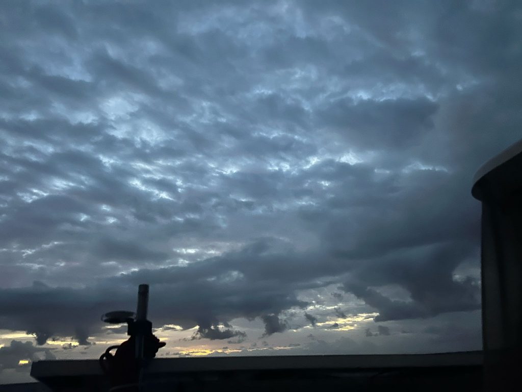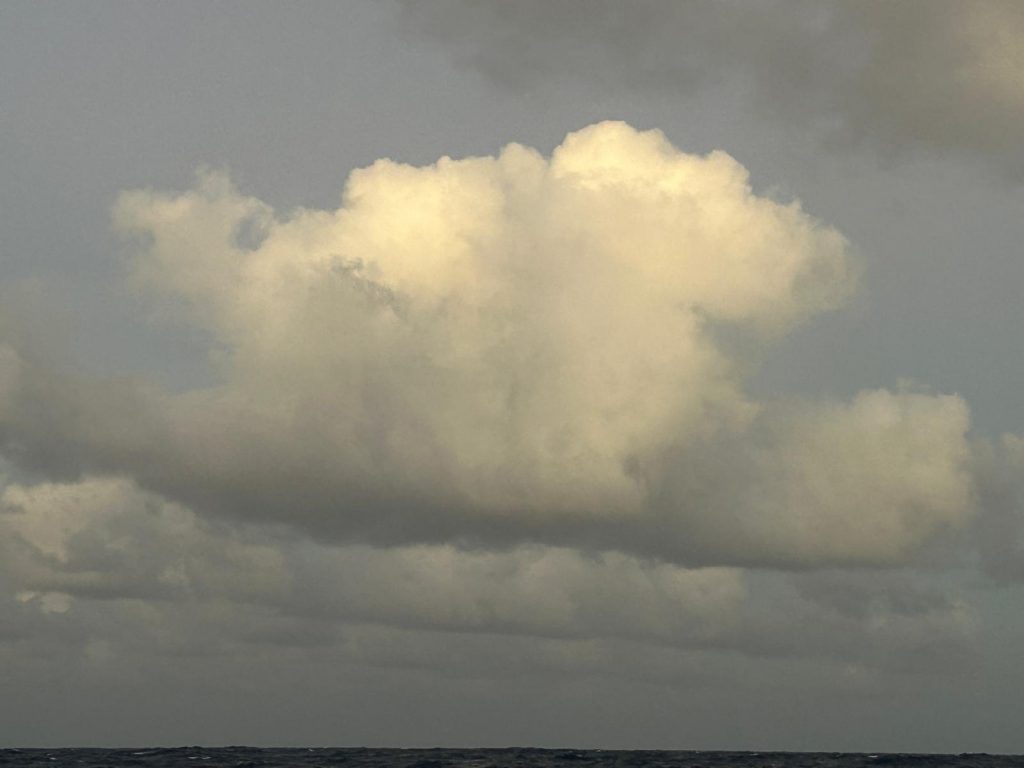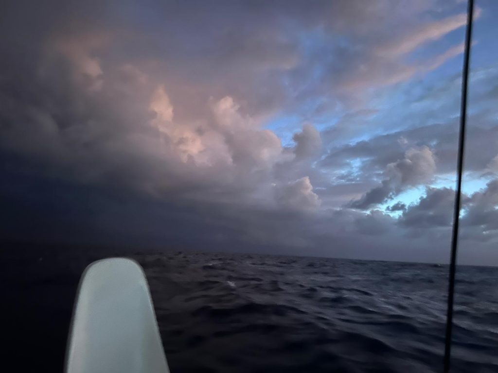 Le vent souffle autour de 16 nœuds, sous un ciel voilé de gros nuages blancs épais où le soleil peine à percer. Avec les batteries à 70 %, j’ai démarré les moteurs pour quelques heures afin d’assurer une nuit sans souci électrique. J’ai tenté de pêcher avec Alex, mais sans succès : trop de sargasses. Moralité : à moins de 300 NM des Antilles, la pêche est compromise par ces algues. À moins de 70 NM en ligne droite de la baie de Sainte-Anne, je surveille un ciel encore menaçant.