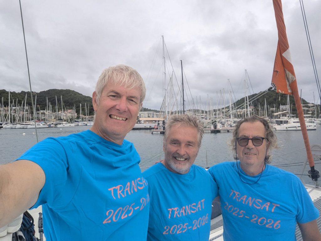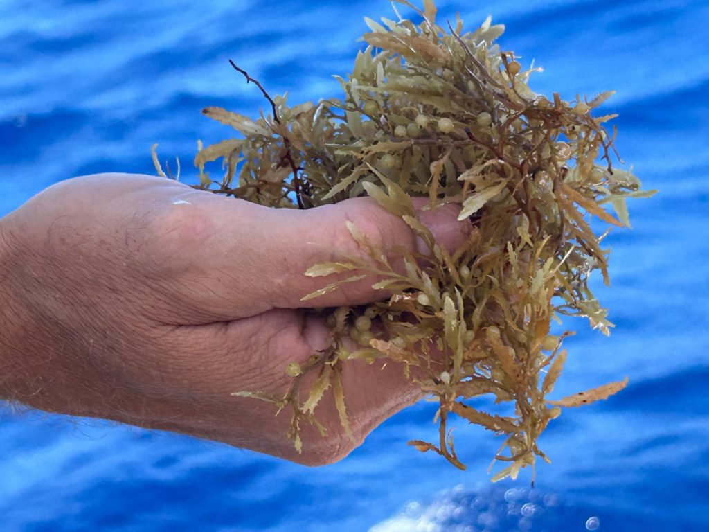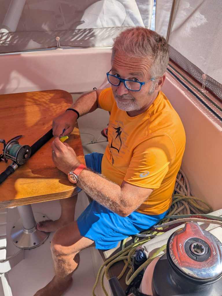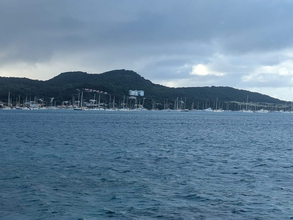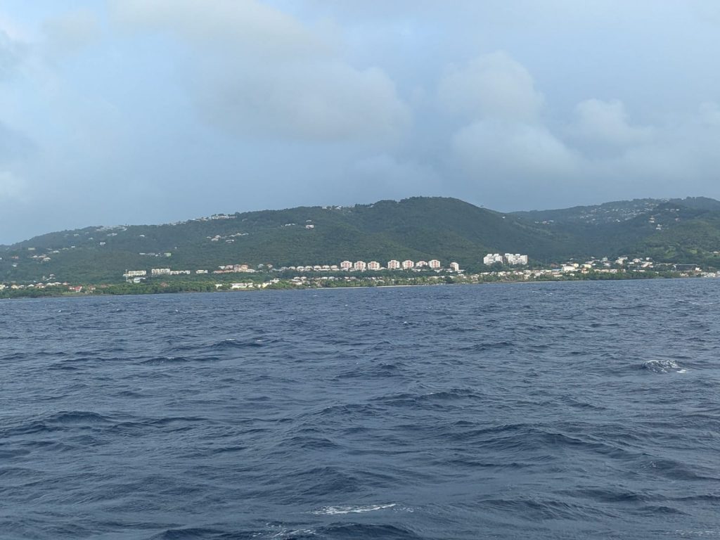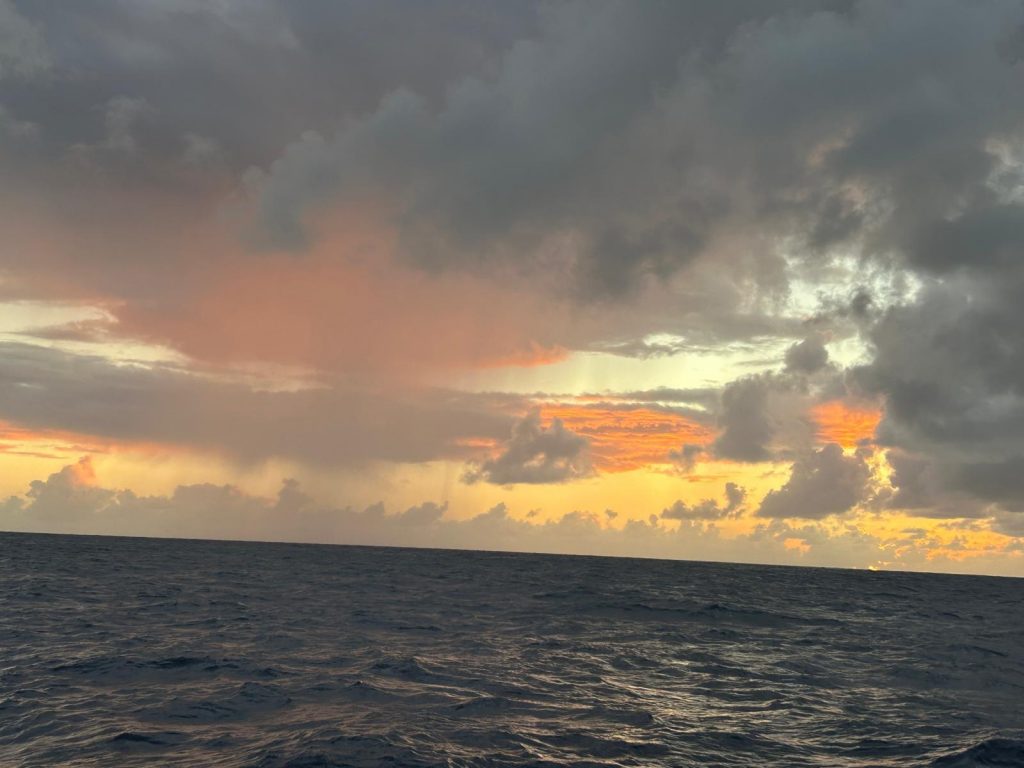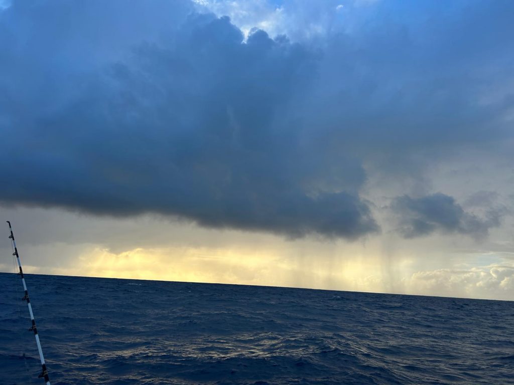 Le vent souffle autour de 16 nœuds, sous un ciel voilé de gros nuages blancs épais où le soleil peine à percer. Avec les batteries à 70 %, j’ai démarré les moteurs pour quelques heures afin d’assurer une nuit sans souci électrique. J’ai tenté de pêcher avec Alex, mais sans succès : trop de sargasses. Moralité : à moins de 300 NM des Antilles, la pêche est compromise par ces algues. À moins de 70 NM en ligne droite de la baie de Sainte-Anne, je surveille un ciel encore menaçant.