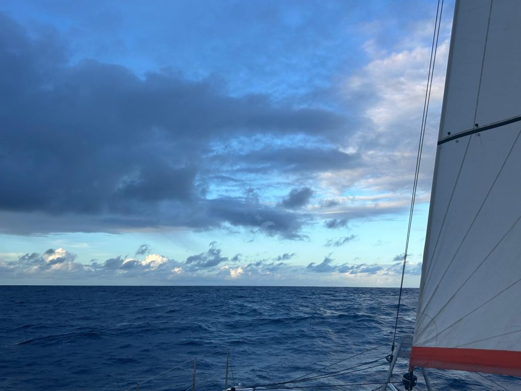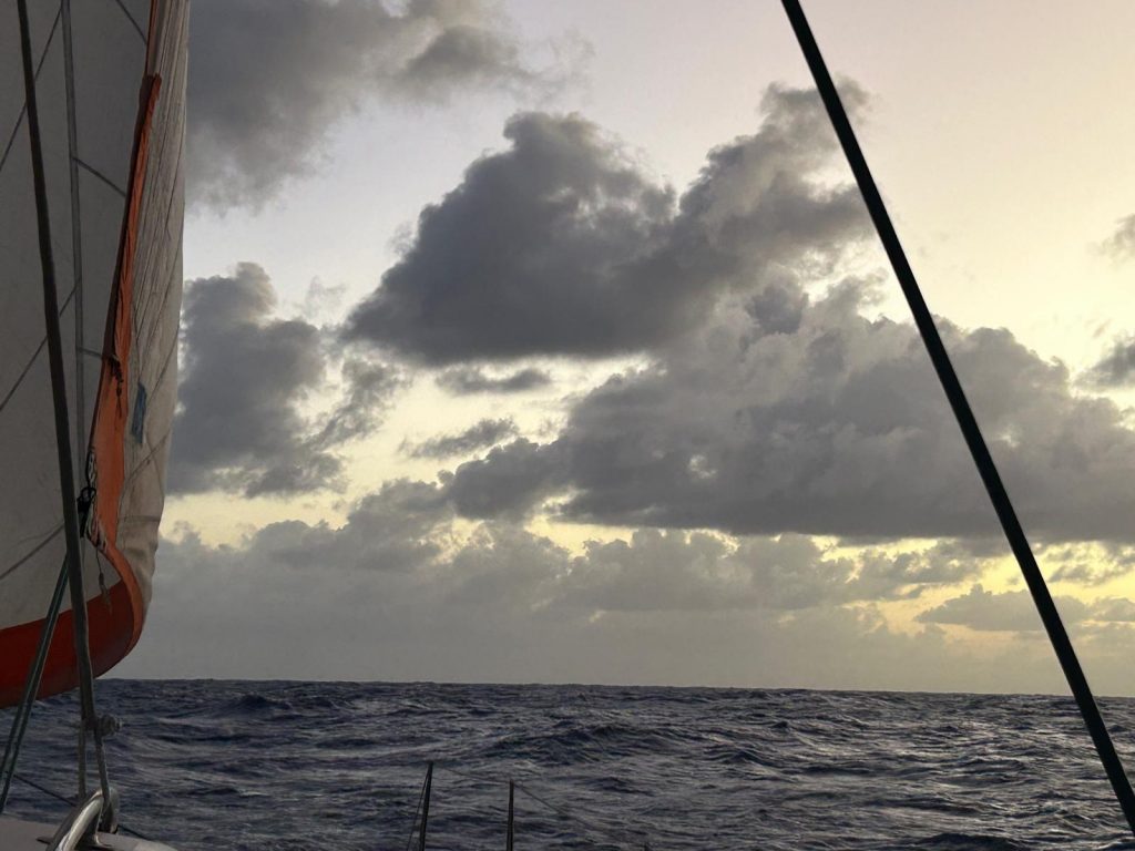 Le bateau file au vent avec une stabilité légère. L’idée d’une dépression ou d’un grain reste omniprésente, car depuis plusieurs jours, des nuages bas, gris et épais parsèment le ciel devant nous. Je scrute régulièrement le baromètre, la mer et les nuages pour me rassurer. Il nous reste environ 450 NM pour atteindre la Martinique, après plus de 1600 NM déjà parcourus.