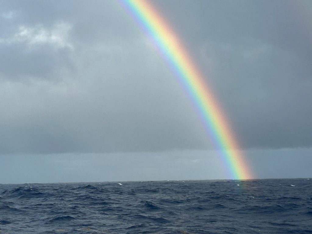 La houle se régularise et le vent se maintient autour de 16 nœuds. La vitesse en surface varie entre 6,5 et 8 nœuds. Toujours un ris dans la grand-voile, solent plein, cap au grand largue. Notre oiseau n’a pas survécu à la nuit… Le ciel est gris, sans soleil, et les moteurs ont tourné dès 4h30 pour recharger les batteries. Nous avons parcouru plus de 60 milles nautiques en 8 heures cette nuit.