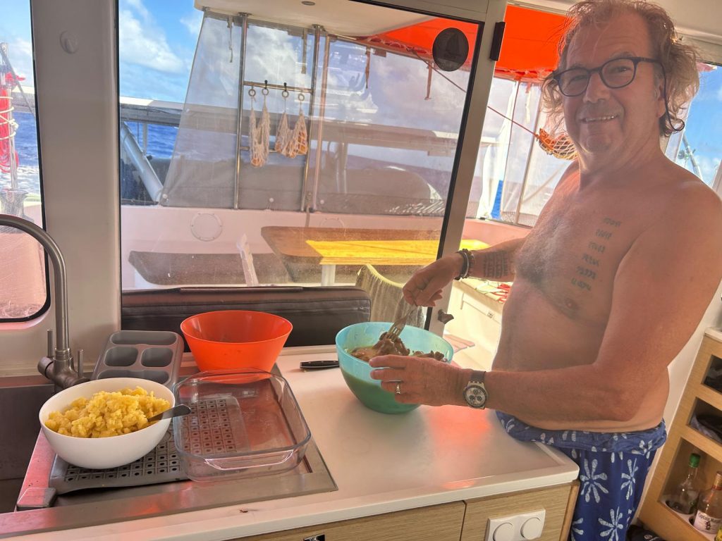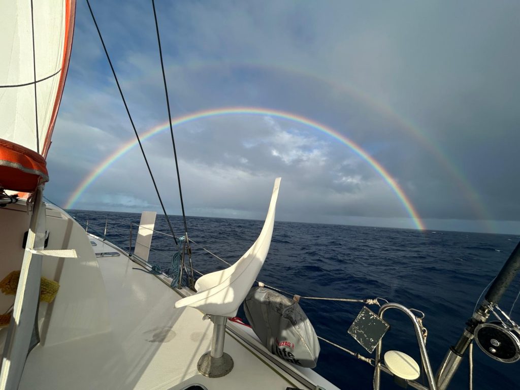 Le soleil est au rendez-vous, malgré les nuages omniprésents. Les moteurs seront arrêtés plus tôt pour notre recharge quotidienne. Alex travaille un peu tandis que Dom nous prépare poisson, aïoli et pommes de terre. On aperçoit un arc-en-ciel.