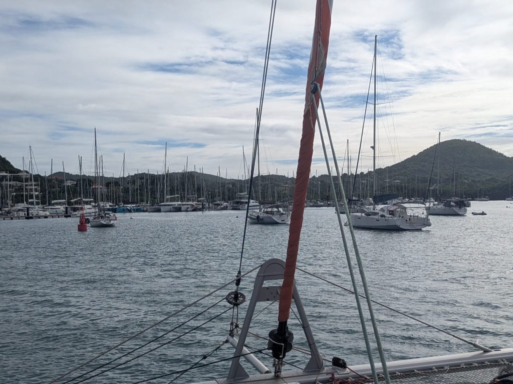 De gros nuages persistent et le risque d’averses reste présent. Le vent est modéré, avec un TWS de 15 nœuds. Une petite houle accompagne le courant, dans le sens du cap pris vers le Marin. La réservation à la marina se fait sur leur site internet via le portail Alizée, tout comme le paiement en ligne pour valider l’emplacement, dont le prix est incroyable : moins de 40 euros la nuit. En fin de matinée, je range et dégivre le frigo.