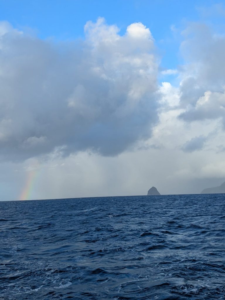 À l’approche de l’île, un grain éclate en une forte averse. Cela ne dure pas et le vent se maintient autour de 18 nœuds. Un dernier empannage dans 2h , et le bateau glisse dans le canal entre la Martinique et Sainte-Lucie.