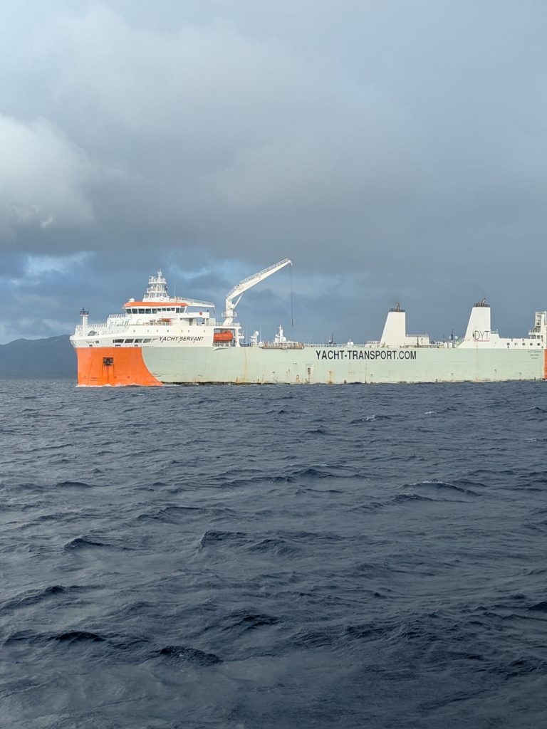 Cerise sur le gâteau, un cargo a emprunté la passe du Marin en même temps que nous… Sa pilotine nous a fait changer de route. Et comme si ça ne suffisait pas, un autre grain encore violent a éclaté au même moment. À la barre et au moteur, je suis trempé.