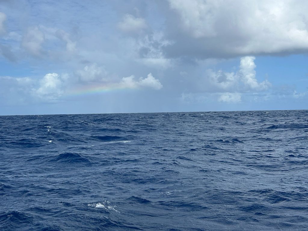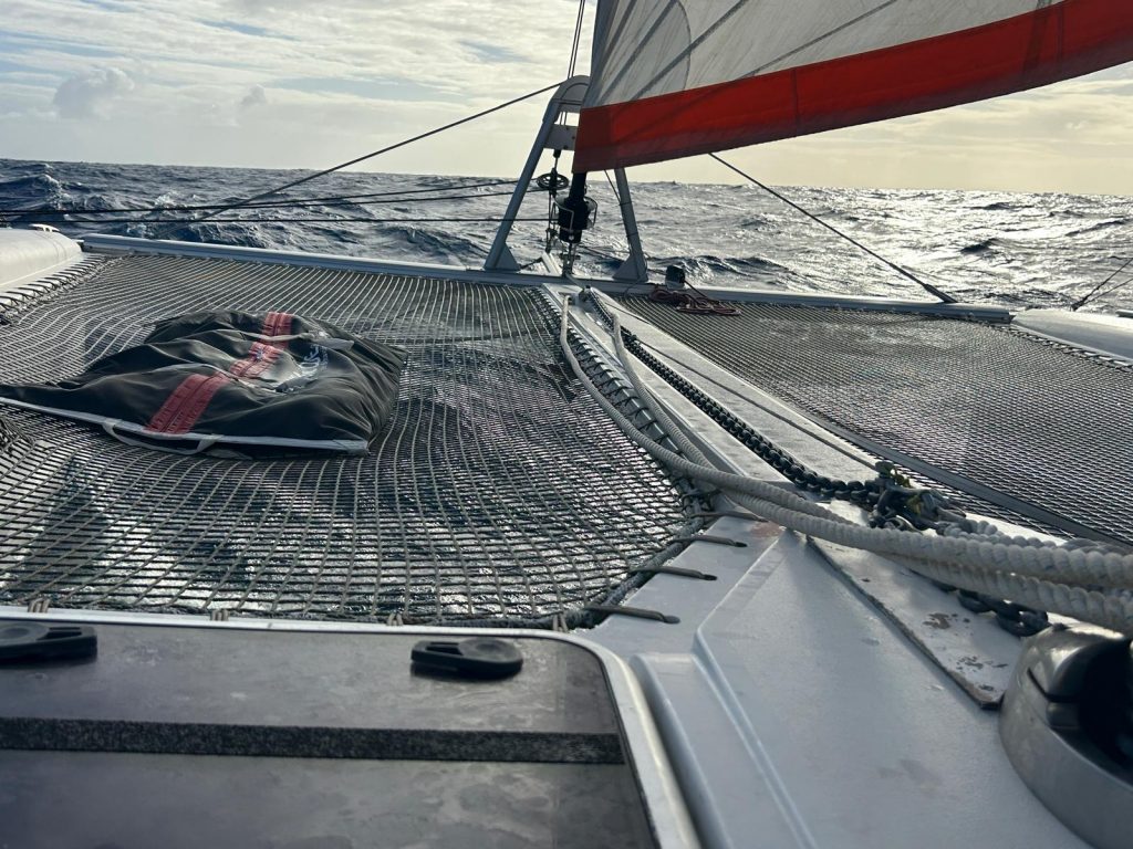 À 9h00 HL, le vent est tombé autour de 16 nœuds, mais la houle reste difficile à gérer. Les moteurs sont en marche pour recharger, mais le soleil, bien présent et sans trop de nuages, laisse espérer un arrêt rapide. Pendant le quart d’Alex, un monocoque sous voiles en ciseaux a failli nous percuter, sans que nous changions de cap.